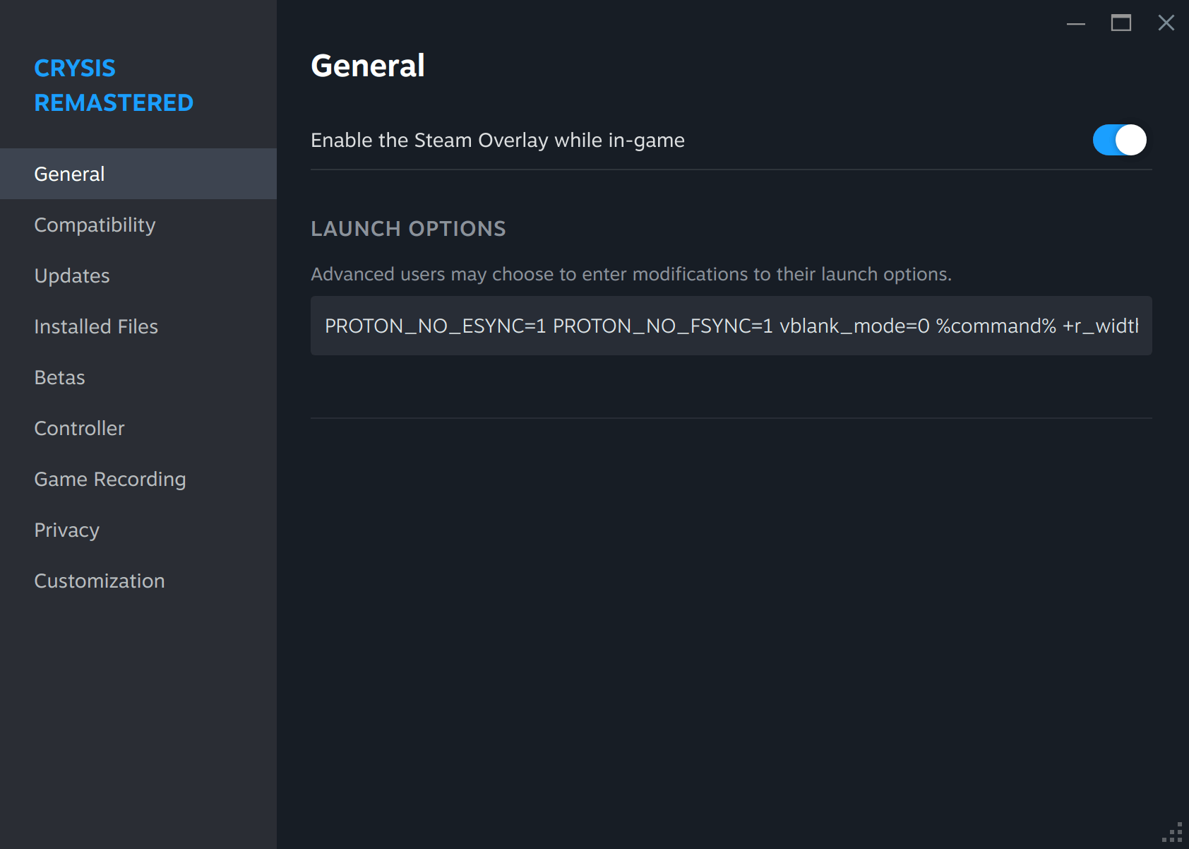 Since CryEngine didn’t want to cooperate with normal options, I used the Steam Launch Options field to force my desired resolution.