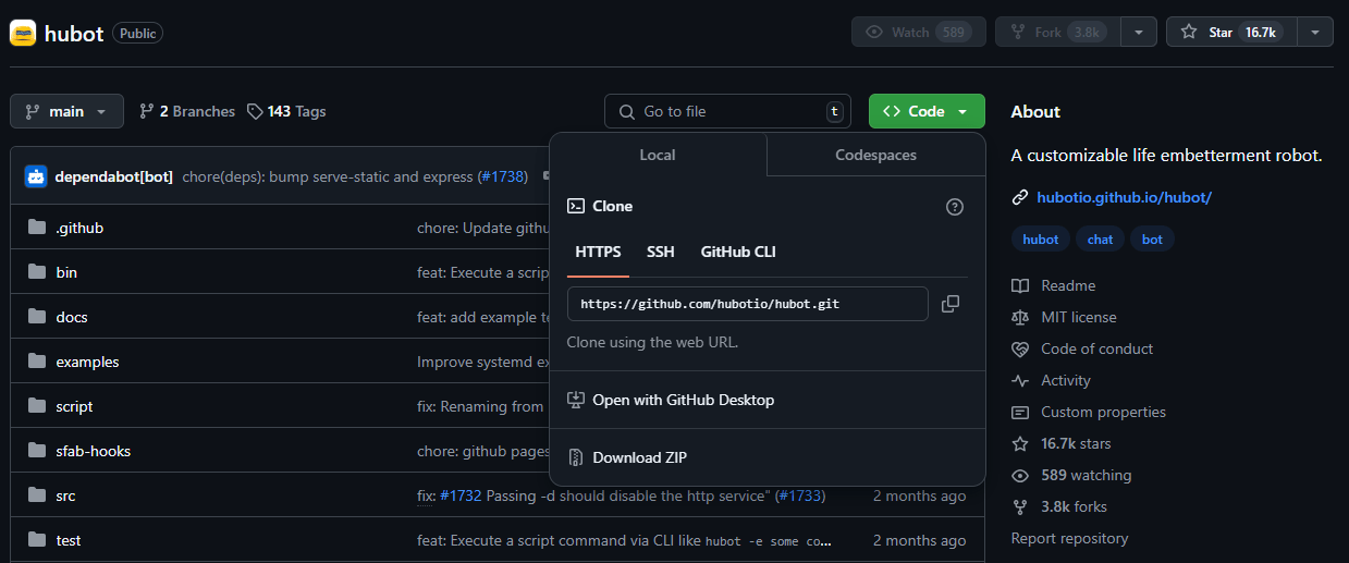 - Go to the GitHub repository page of the project you want to clone (in this case, Hubot).