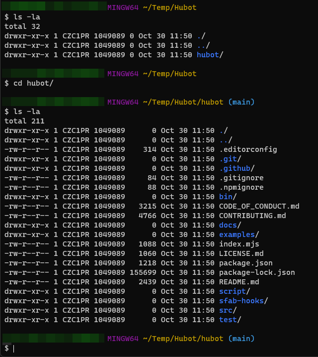 Git will begin downloading the repository’s data, including the entire history. For small projects like Hubot, this process should only take a few seconds.