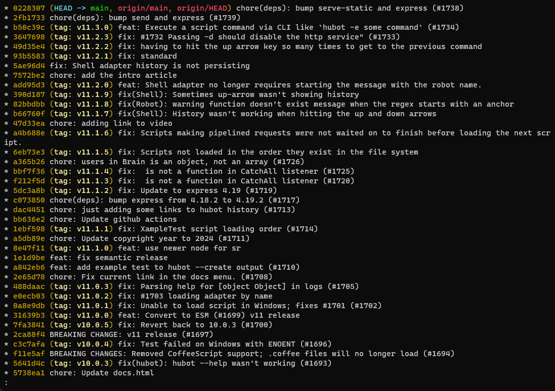 git log --oneline --graph OutputEach line in the output represents a commit, with a unique identifier (the commit hash) and a brief message describing the change. The graph visualization also shows how different branches and merges occurred over time.
