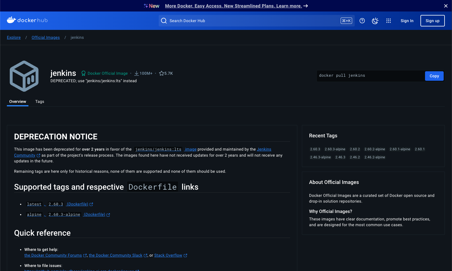 The official Jenkins Docker image is available on Docker Hub. Navigate to Jenkins Docker Hub to review available tags and documentation.