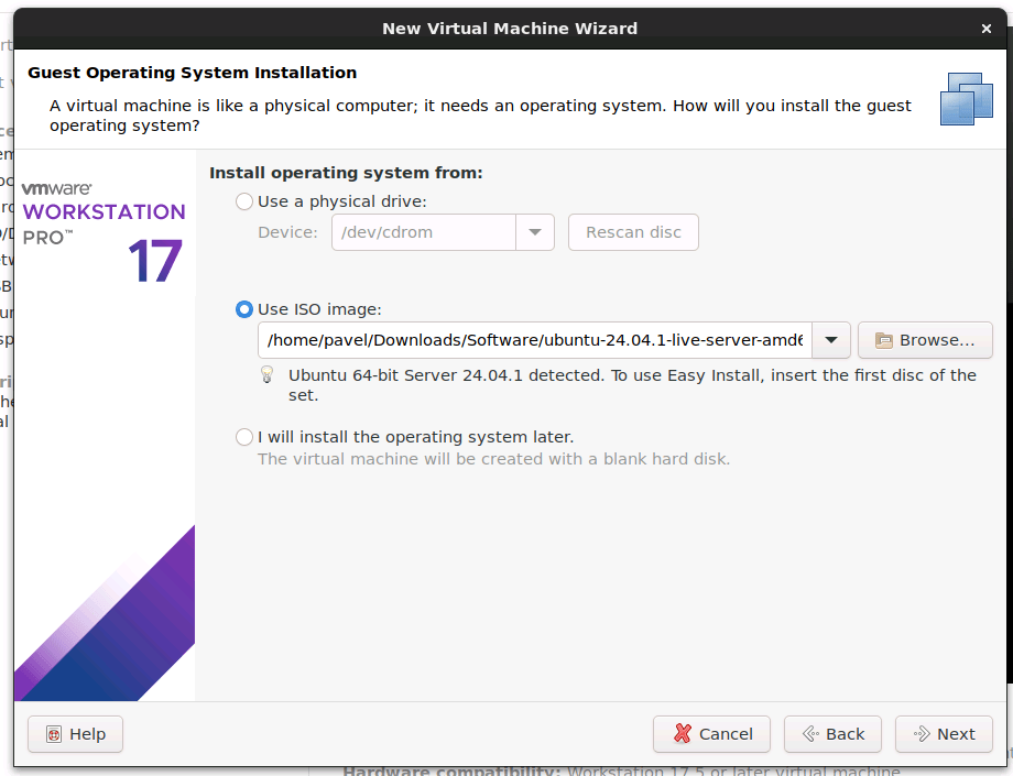 In this step, you’ll choose the operating system you want to install. VMware Workstation offers several installation media options: