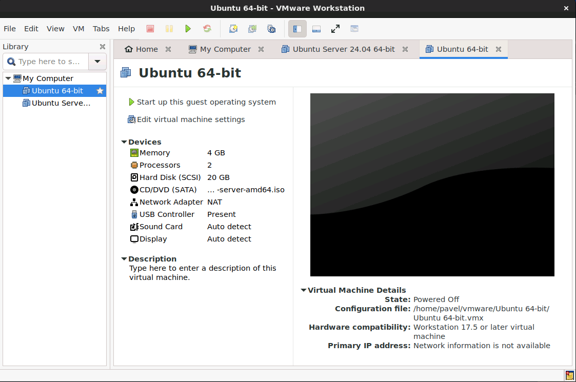 After reviewing the settings, click Finish. VMware Workstation will now create the virtual machine using the specified configuration. You’ll be taken back to the main screen, where you can see the new VM listed in your library.
