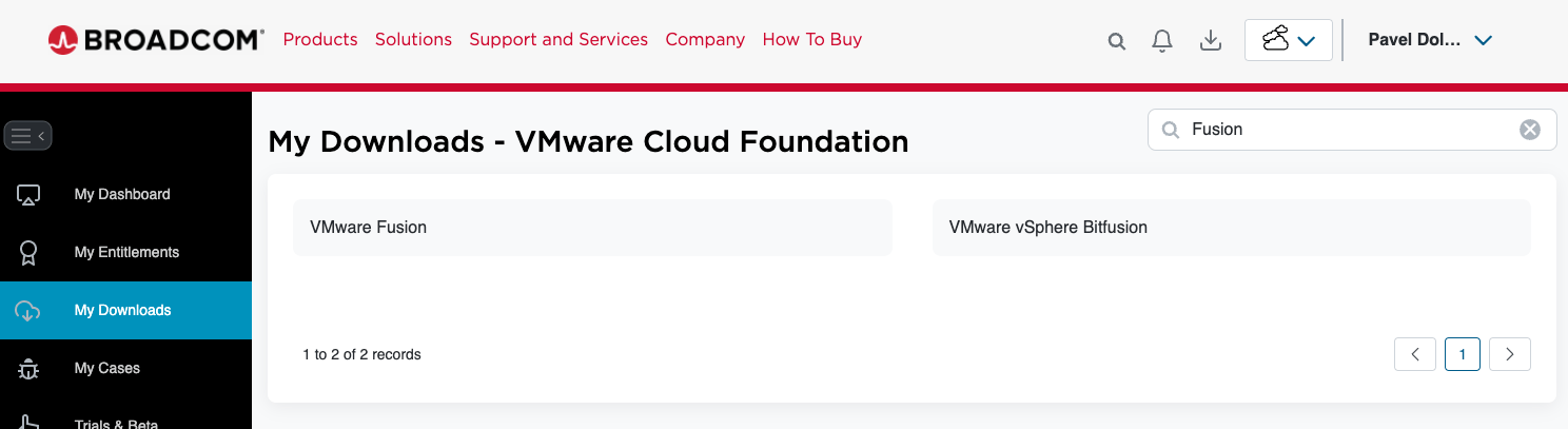 Once in the Downloads section, use the search bar to search for either Fusion. You should see options for both VMware Fusion and VMware vSphere for Personal Use.