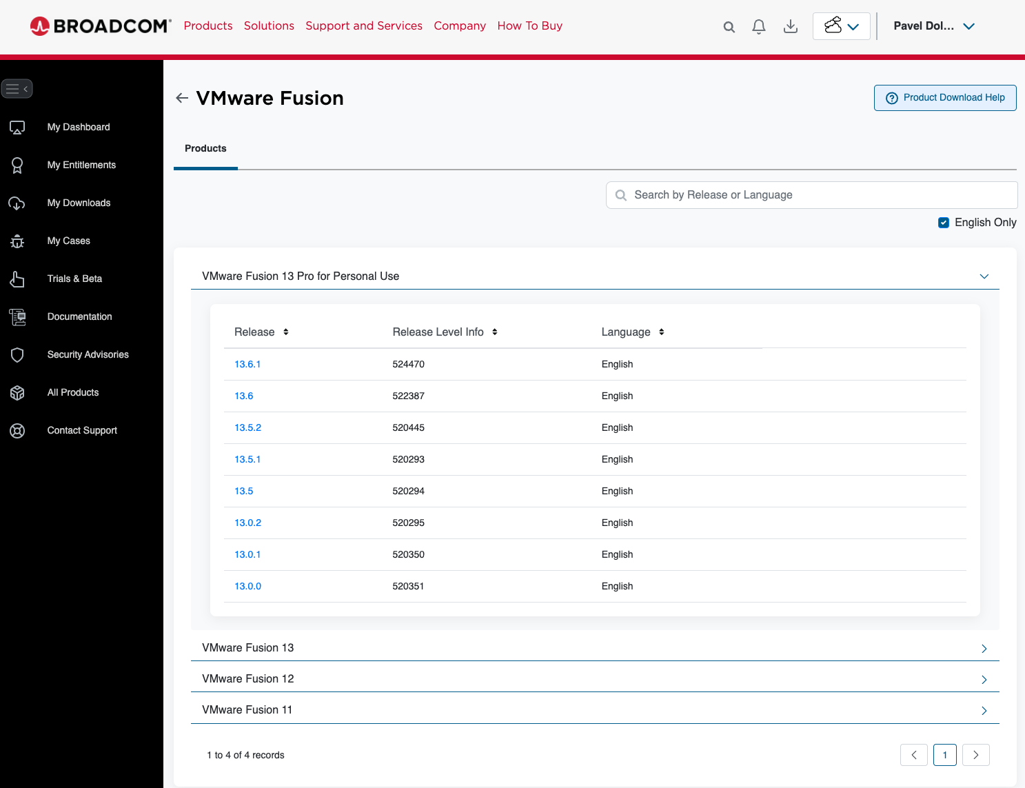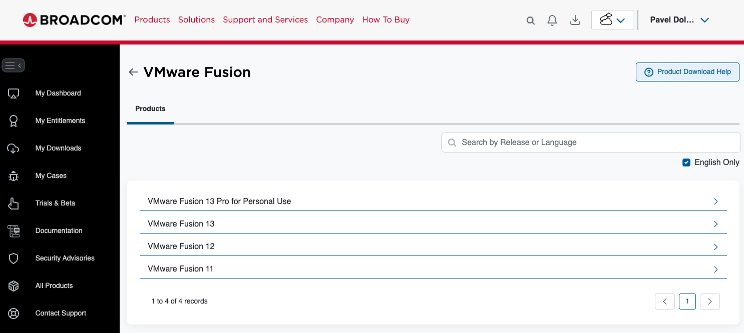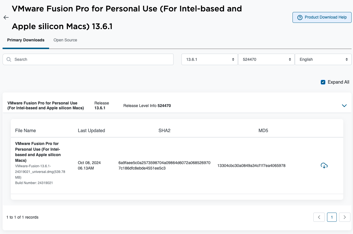 Next, select the desired version of VMware Fusion Pro. Currently, the latest and greatest release is 13.6.1.