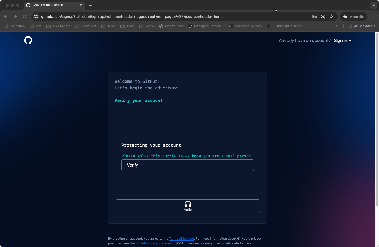 - Solve a CAPTCHA: Before completing the process, GitHub will ask you to solve a logic problem to prove you’re not a robot. This may include identifying objects in pictures or solving a simple puzzle.