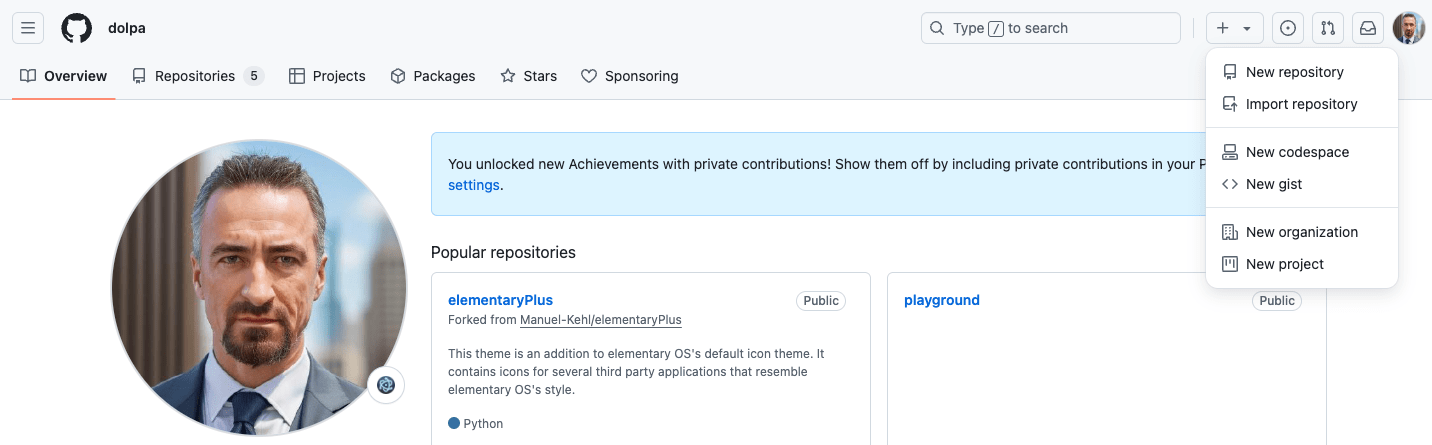 - Click the "+" Button: In the top-right corner of the page, you’ll see a “+” button with a dropdown arrow. Click it and select New repository from the dropdown.