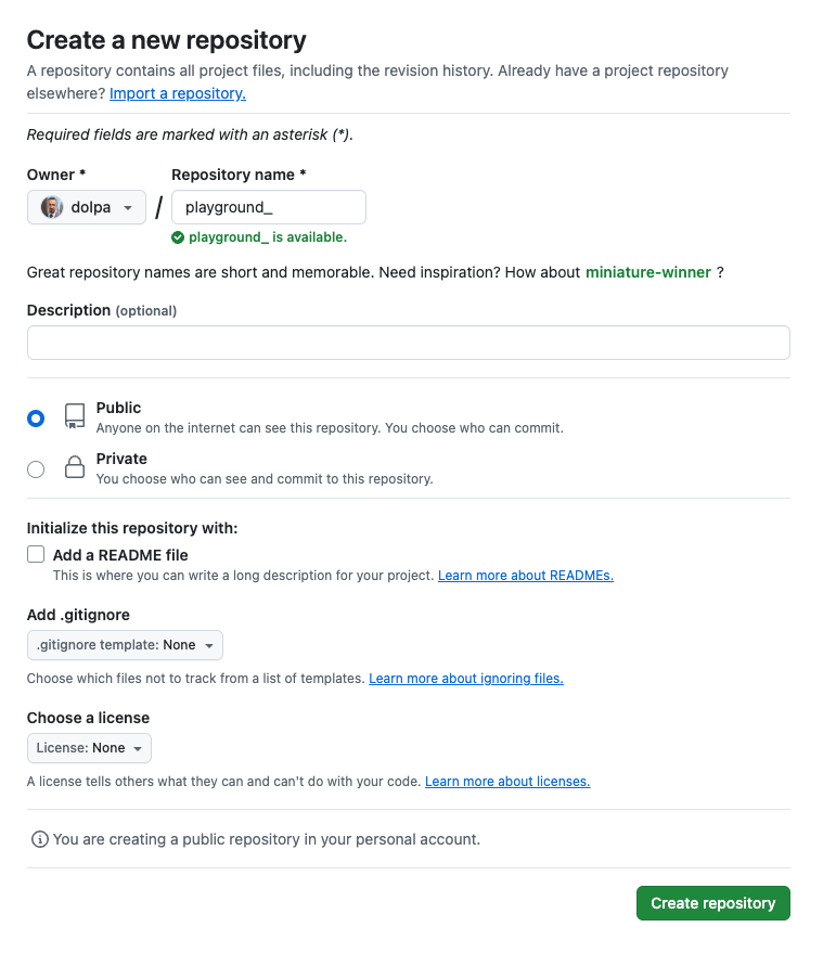 playground. - Description (Optional): You can add a short description to let others know what your repository is about. This is optional.