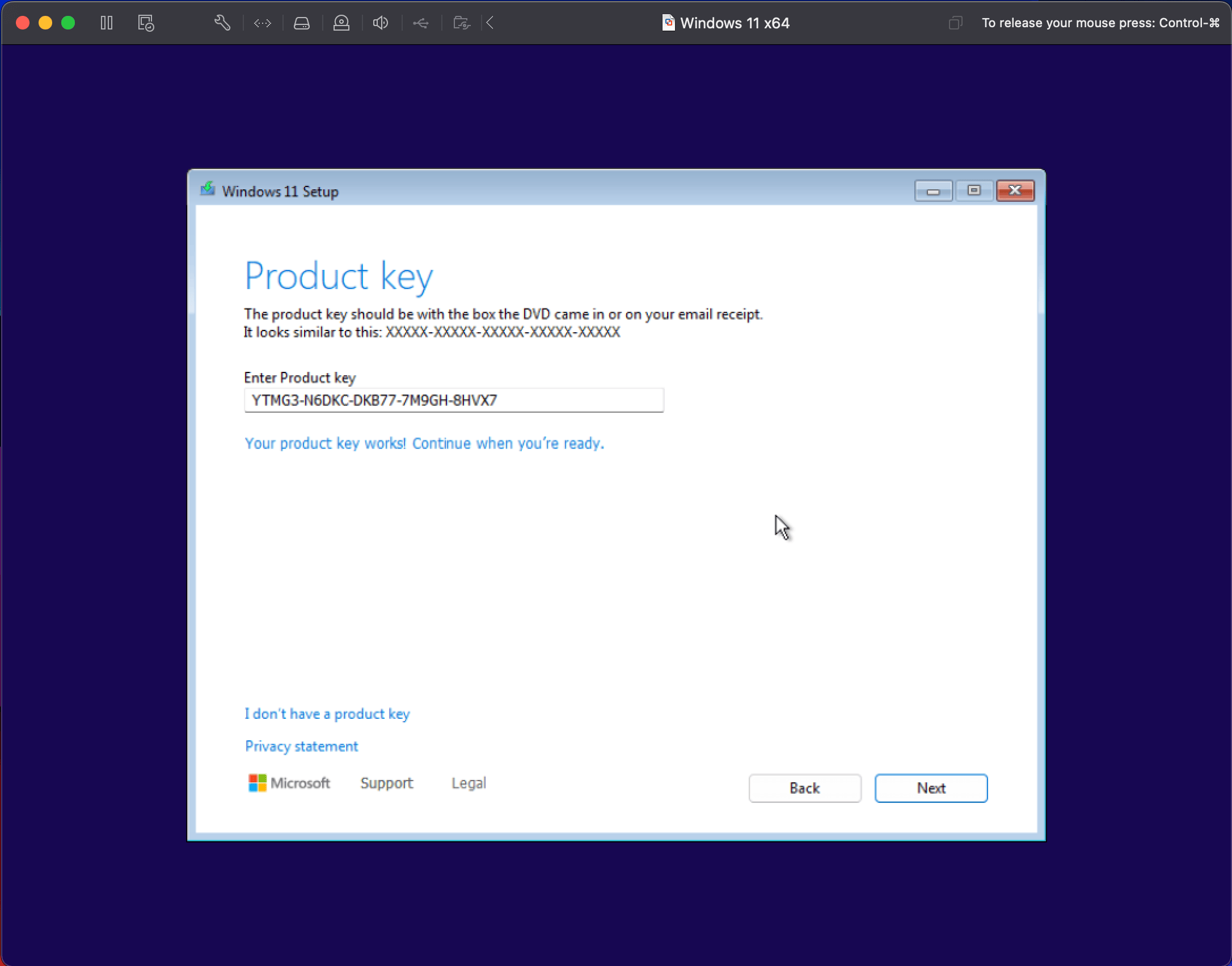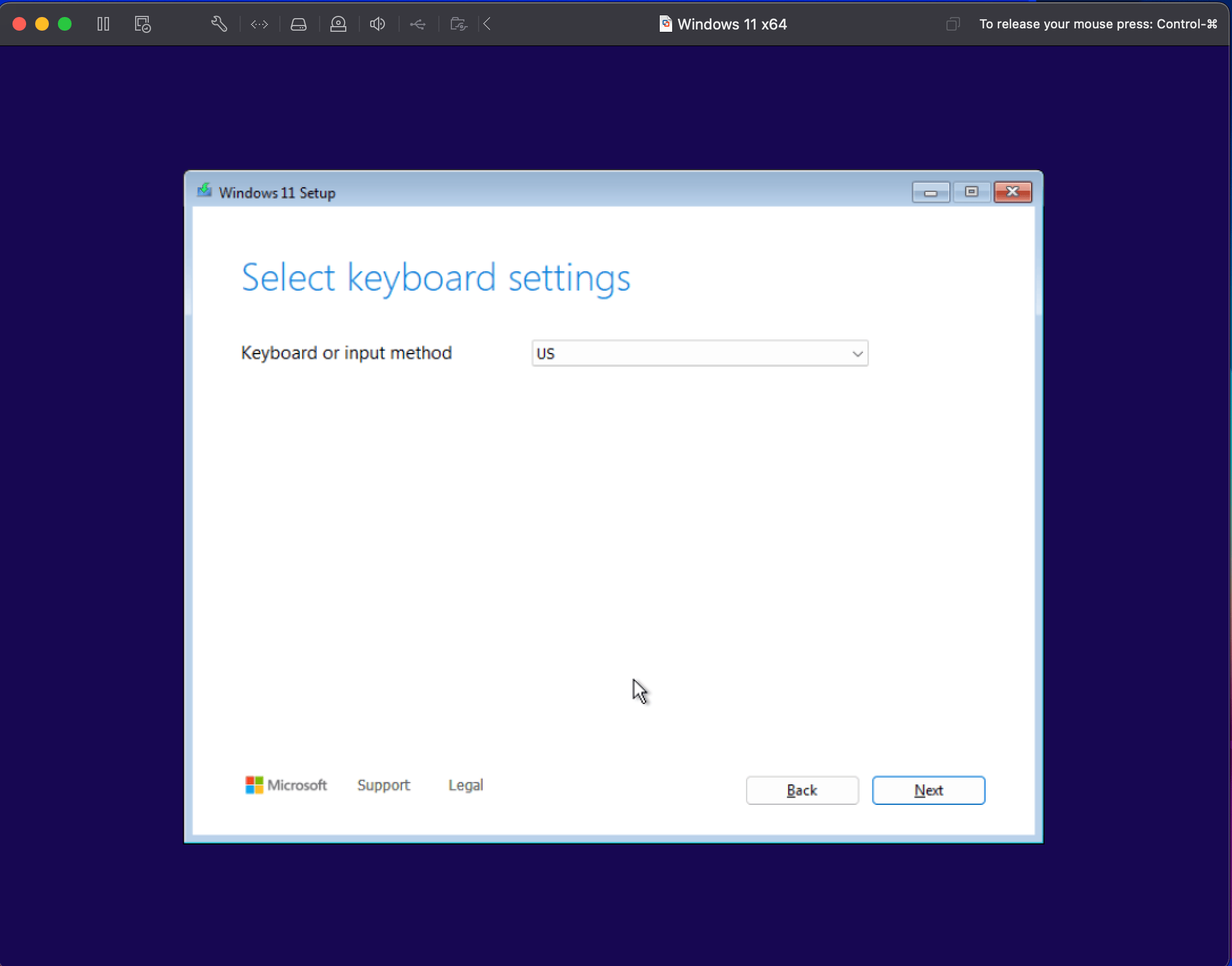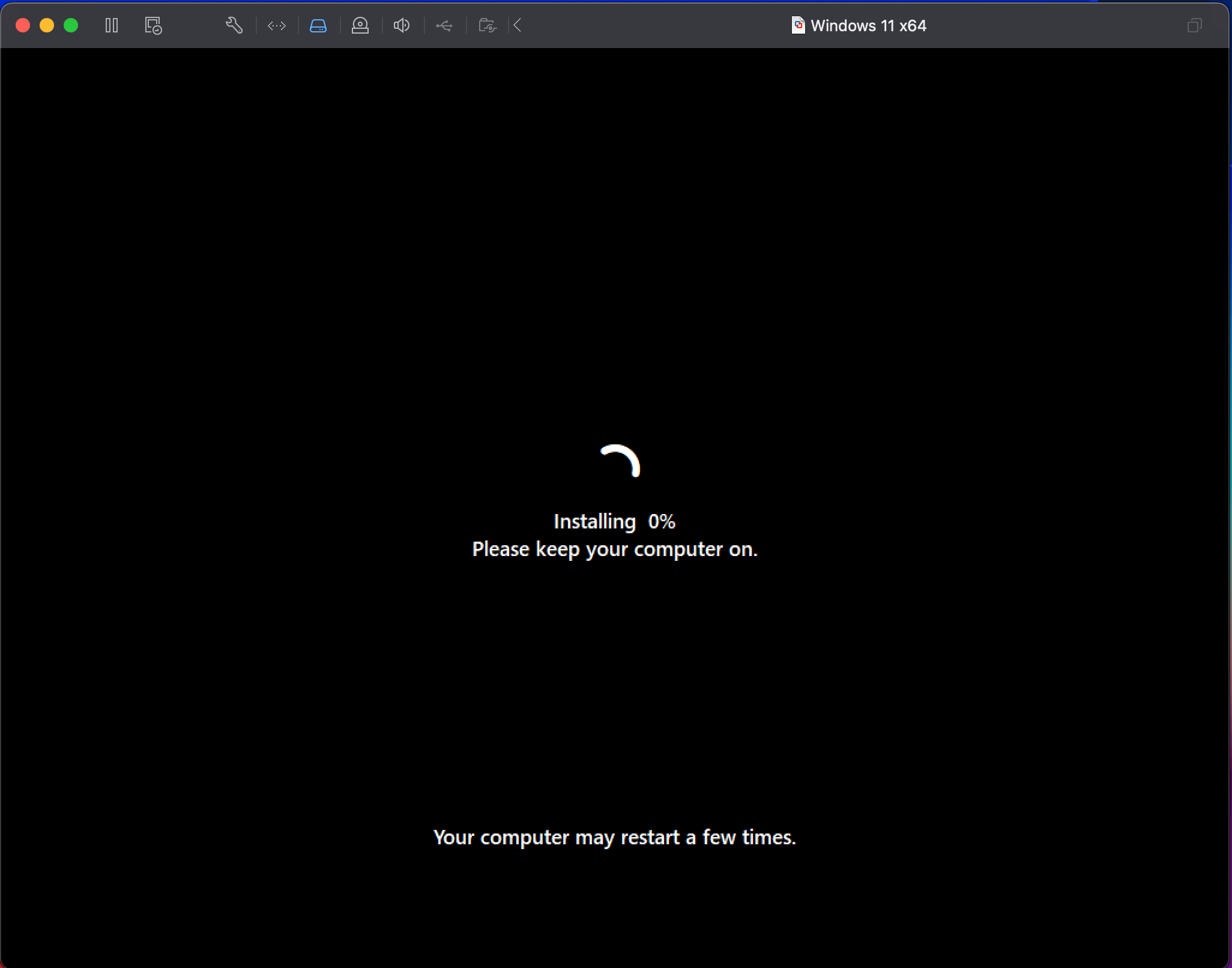 At this point, Windows 11 should begin installing. If it seems like it's stuck or frozen, welcome to the club. But seriously, if it does, just restart the VM and give it another go. Sometimes even Windows needs a coffee break. In my case, simply clicking Back and Next a few times was sufficient.