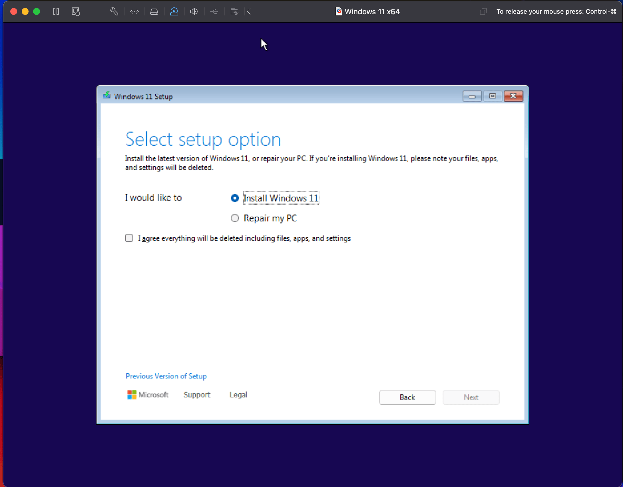 Start the virtual machine, and VMware Fusion will boot from the Windows 11 ISO. You’ll be greeted by the familiar Windows setup screen. At this point, you might wonder why Microsoft couldn’t just let us install this as easily as before. m. Fun fact: It’s possible for the setup to stall here. If it does, just restart and try again. Maybe Windows is just shy?