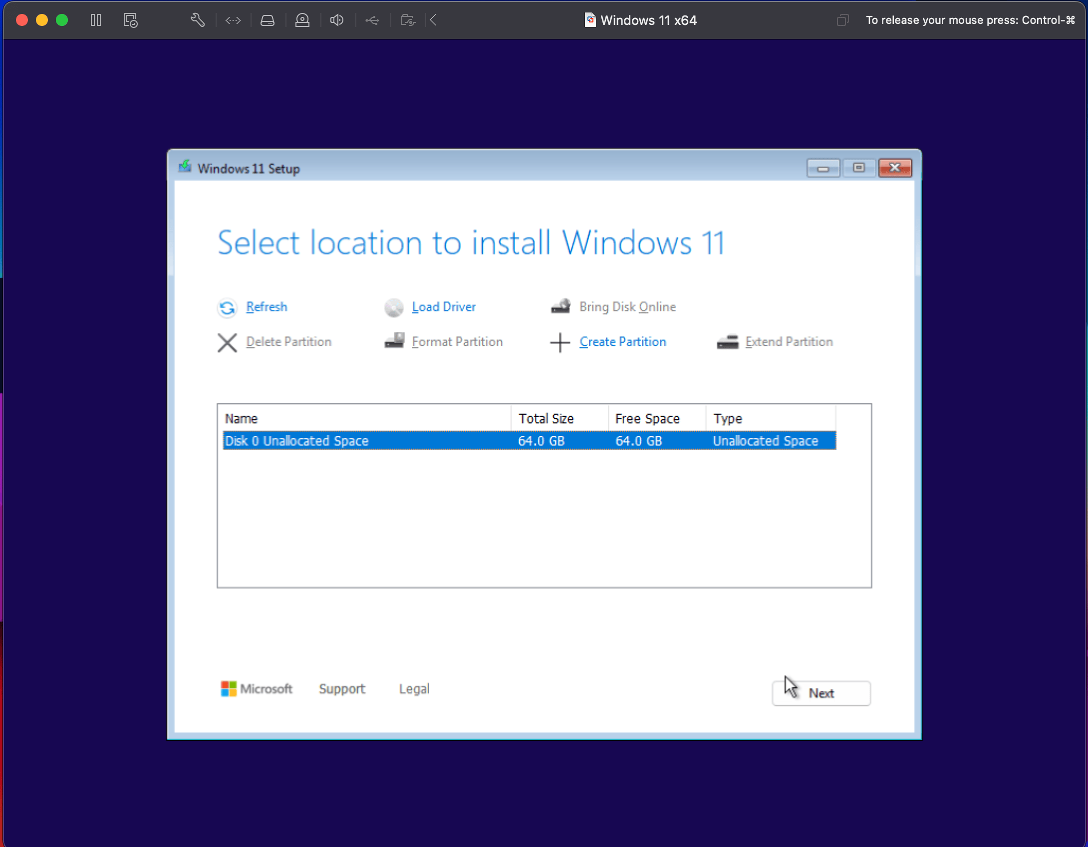 - When asked where to install Windows, you’ll see an unallocated space. Select it and click Next. Virtual hard drives are magical—no need to worry about accidentally formatting the wrong drive (which definitely happened to a friend of mine once…).