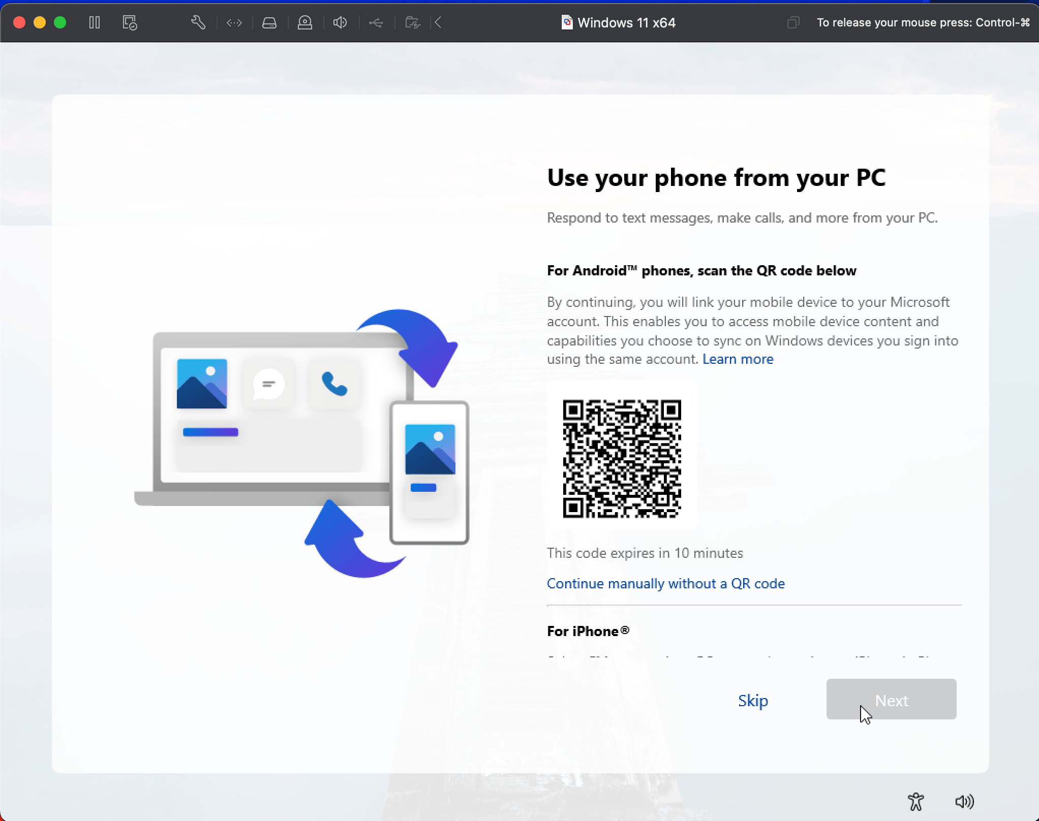 - Next up, you'll encounter the Use Your Phone feature, which prompts you to connect your smartphone to your PC. This integration aims to streamline your experience by allowing you to access notifications, messages, and even apps directly from your Windows desktop. While I appreciate the convenience of having my phone and PC work in harmony, I opted to skip this step for now. It’s one of those features that sounds great in theory, but I figured I’d save it for another day—after all, I’m here to test Git, not to turn my workspace into a tech convention!