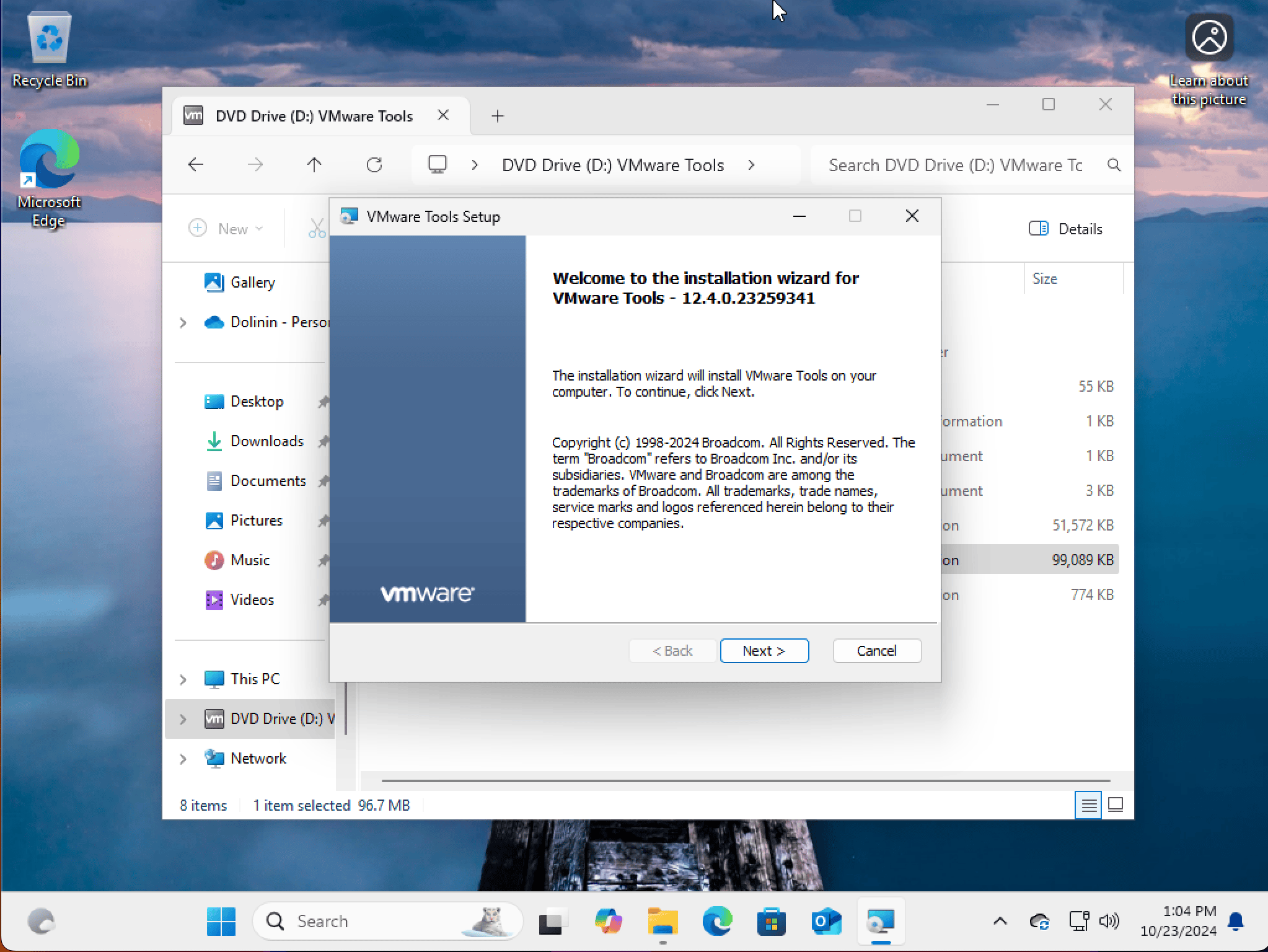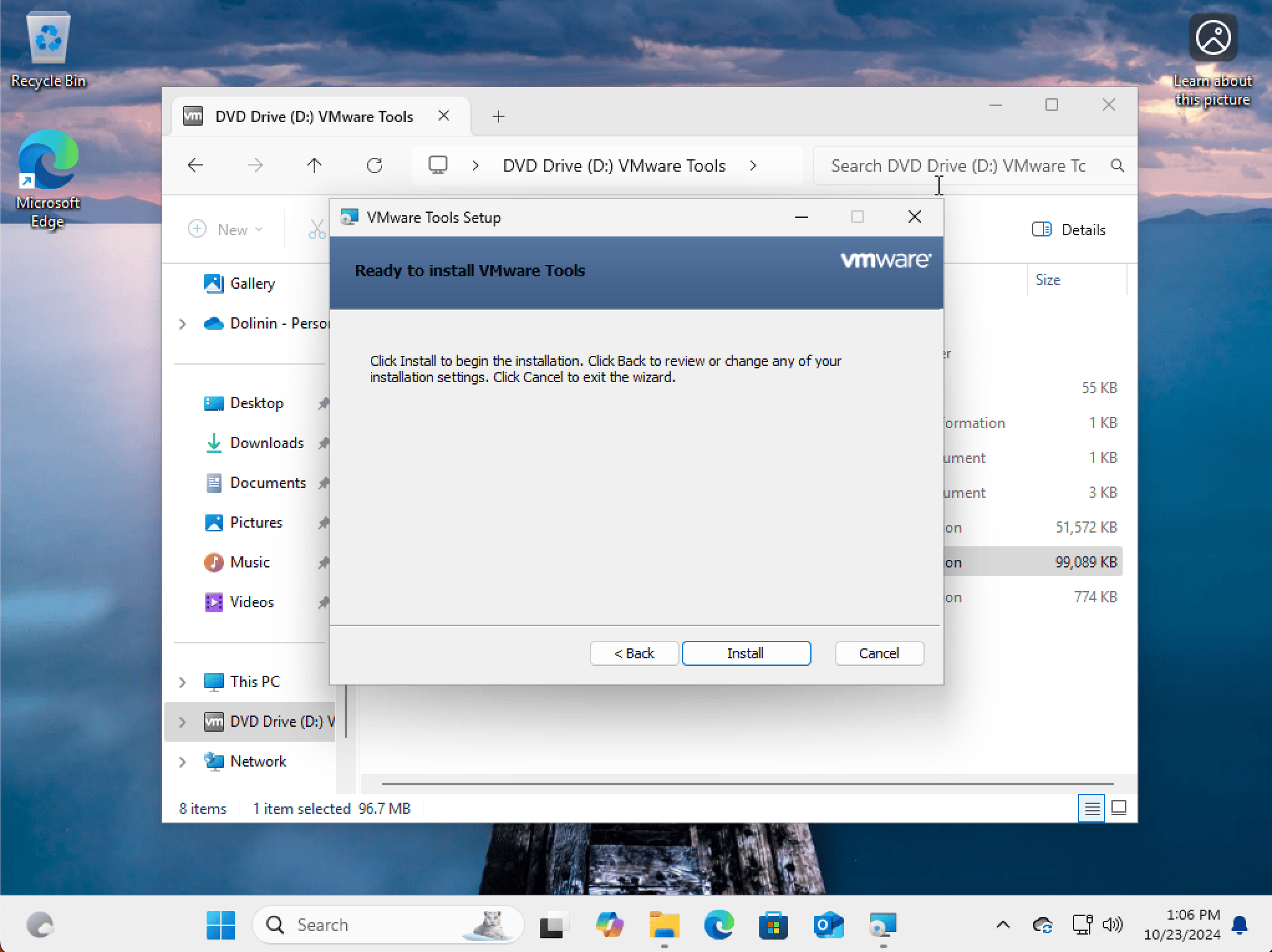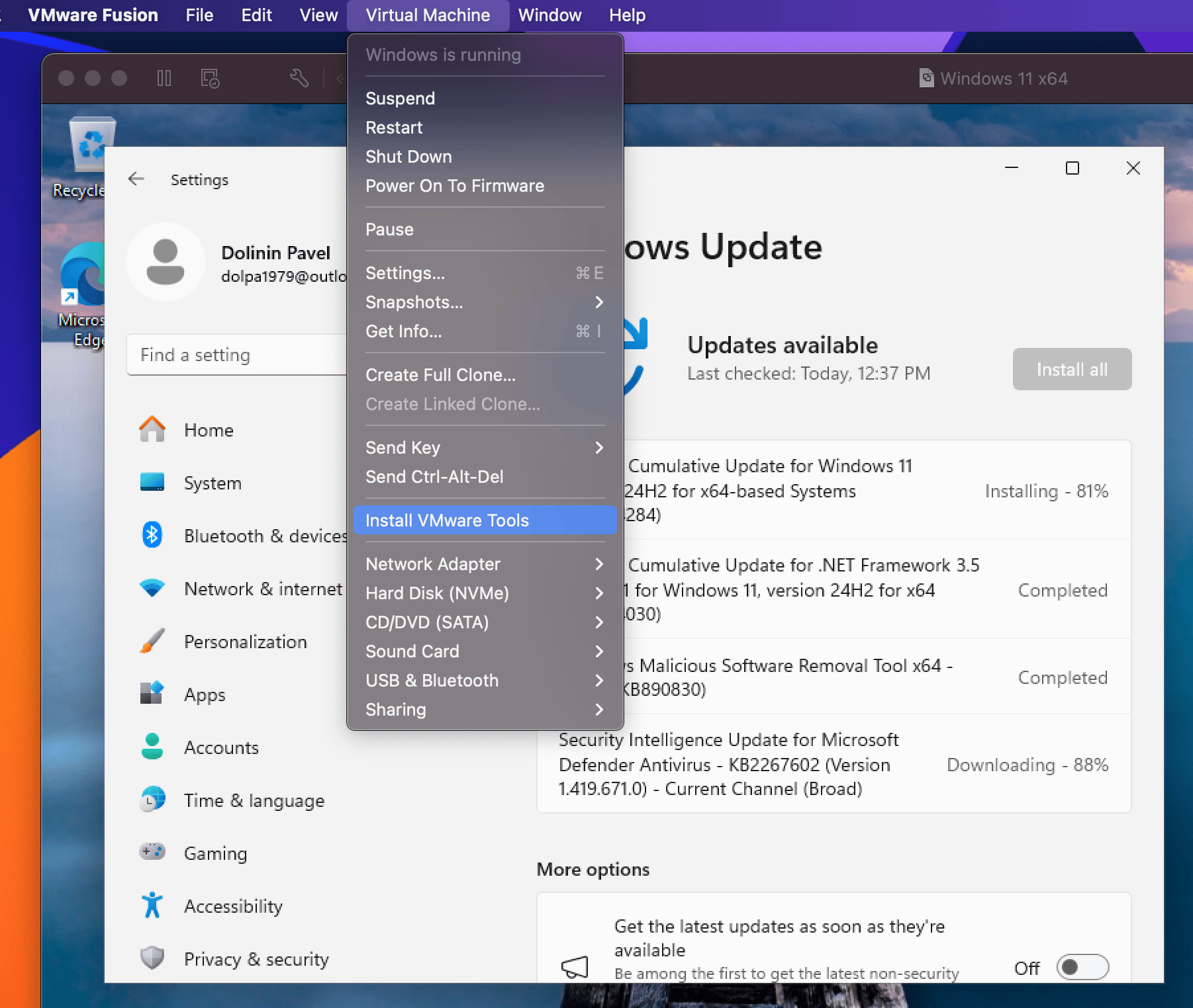 - Once Windows 11 is installed, go to Virtual Machine > Install VMware Tools.