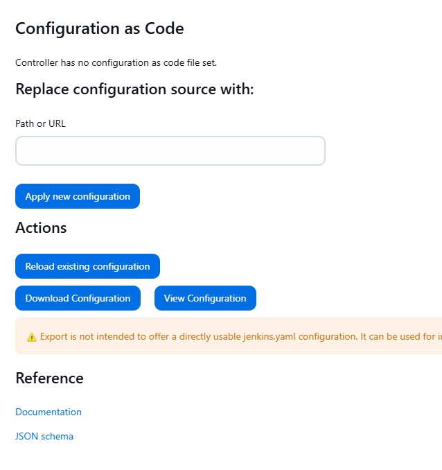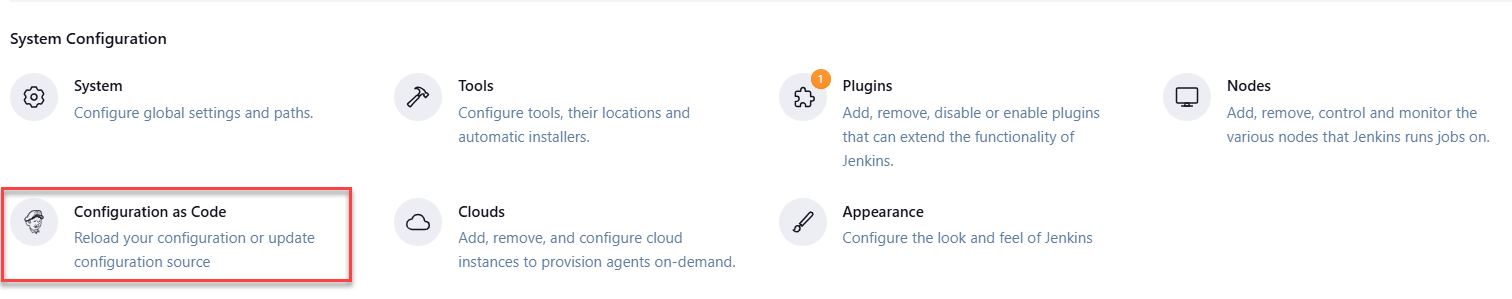 Once the plugin is installed, you should see a new section labeled Configuration as Code under Manage Jenkins. This confirms that the plugin has been successfully installed.