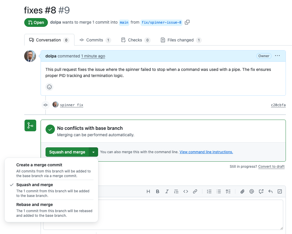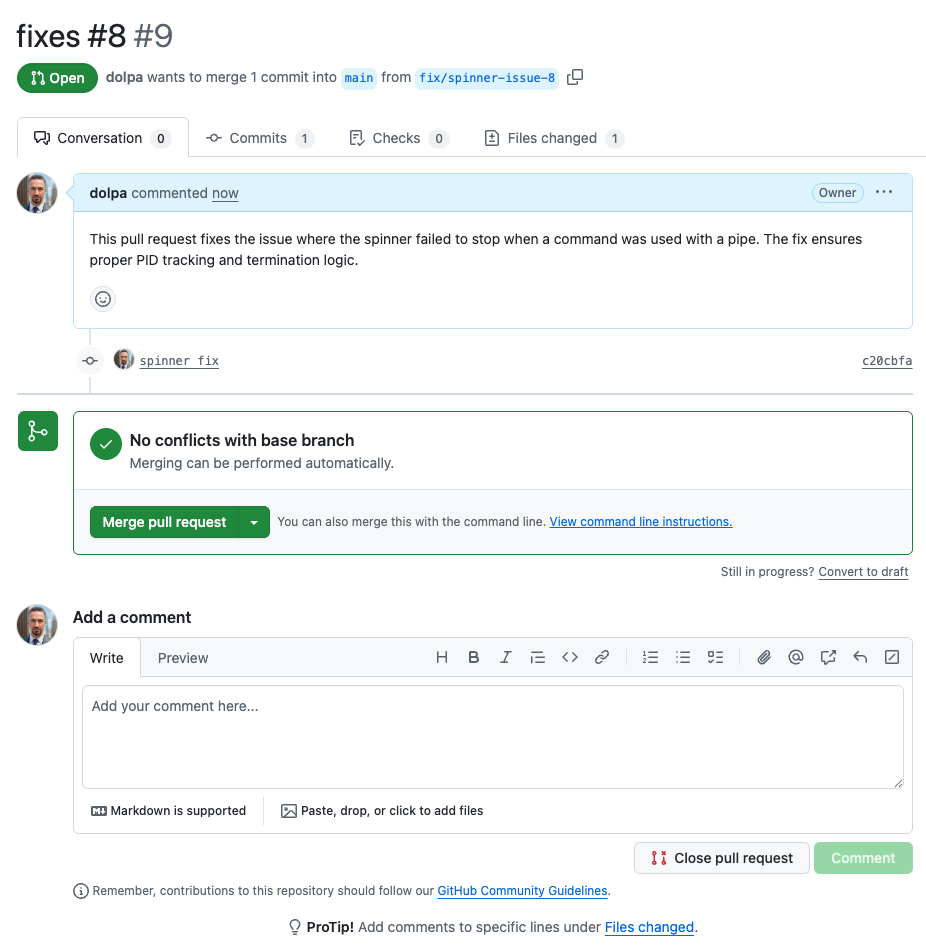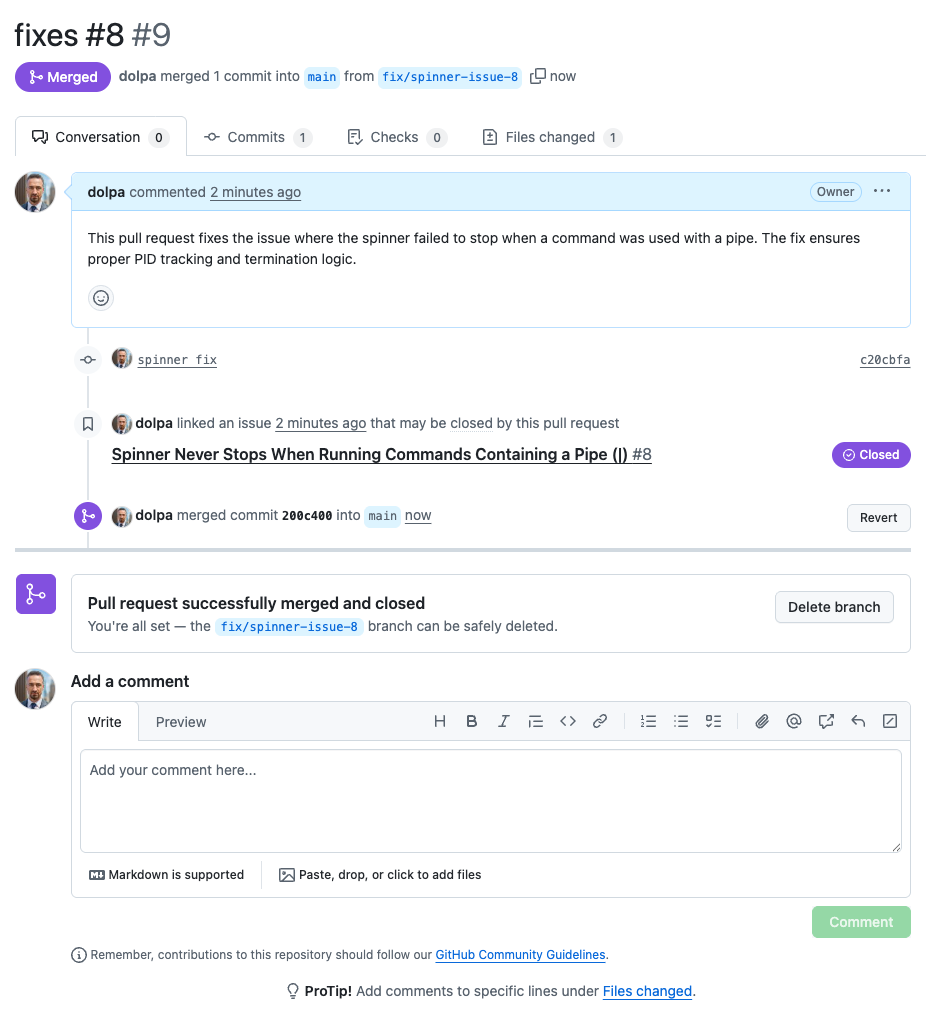 This pull request fixes the issue where the spinner failed to stop when a command was used with a pipe. The fix ensures proper PID tracking and termination logic.
