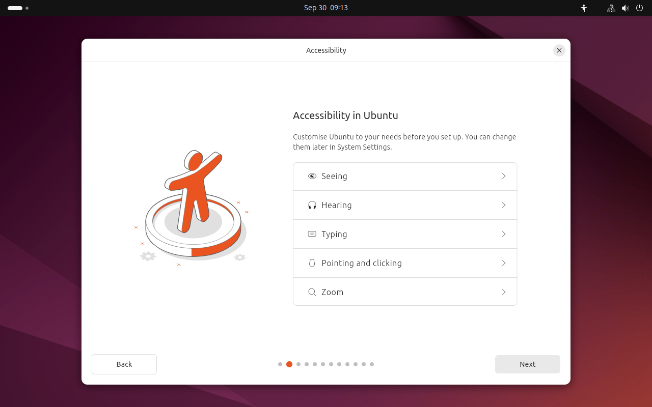 In Ubuntu 24.04, the Choose Accessibility step allows you to configure specific accessibility features, ensuring that the system is ready to assist users with various needs from the start. During this step, you'll see several categories of accessibility options designed to improve the usability of Ubuntu for all users.