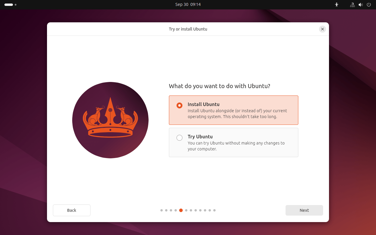 - Try Ubuntu: This option allows you to test Ubuntu without making any changes to your computer. It boots into a live session, where you can explore the desktop, run applications, and access the internet. This is useful if you want to see how Ubuntu works before committing to an installation. If you're satisfied, you can install Ubuntu from the live session later.