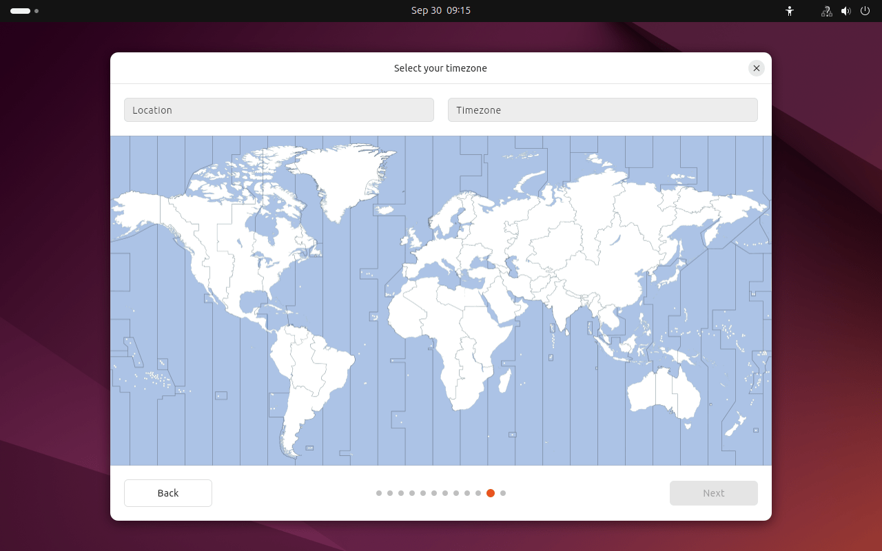 In this step, you'll set your time zone to ensure that your system's clock displays the correct local time. Ubuntu provides a map interface where you can easily select your location. Simply click on your city or region to highlight it. This setting is crucial for scheduling tasks, logging activities, and maintaining accurate timestamps on files. Once you’ve made your selection, click Continue to proceed with the installation.