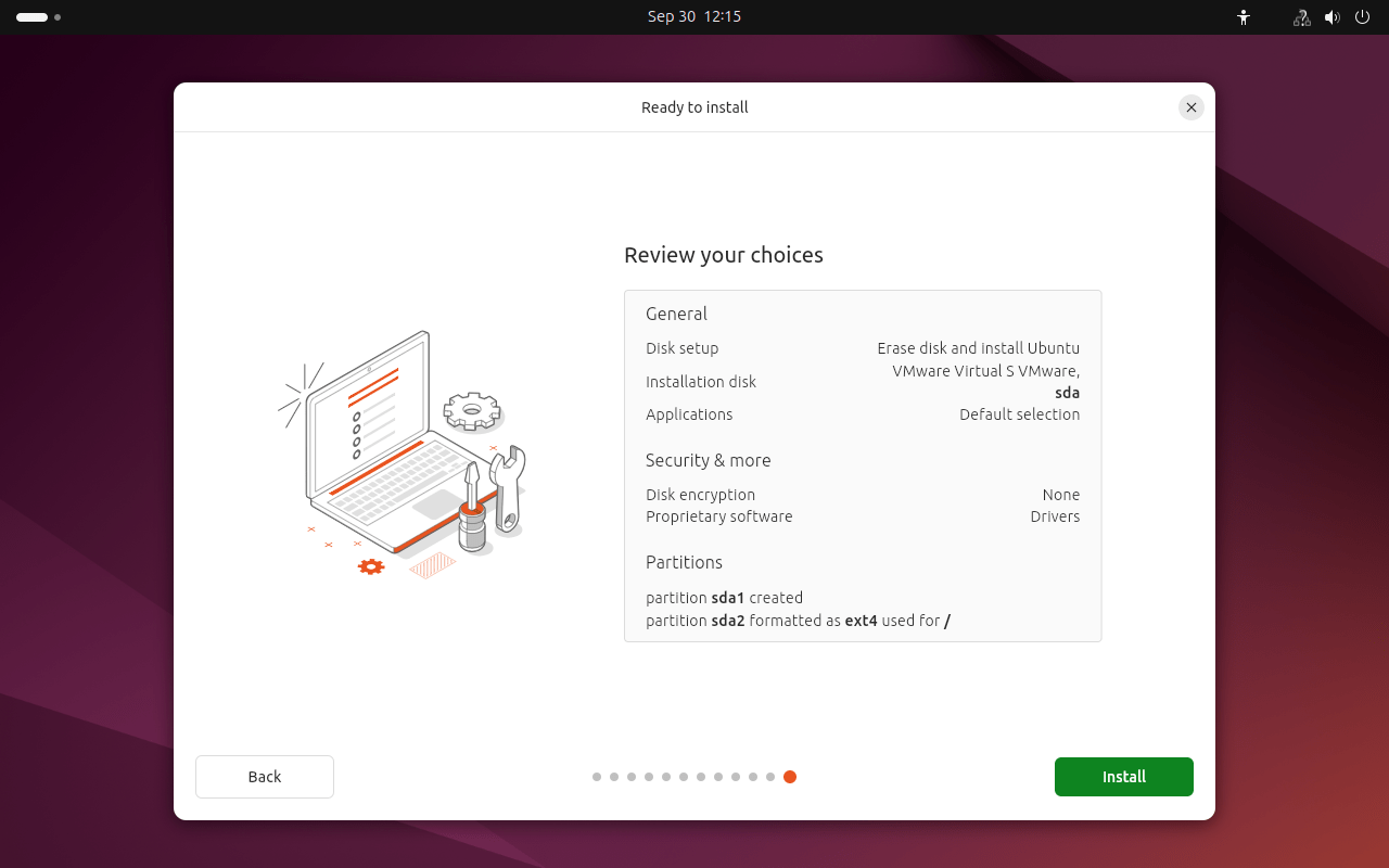 Before proceeding with the installation, the Ubuntu installer presents you with a summary of your selections. This is your chance to double-check that all the information you've provided, such as language, keyboard layout, time zone, installation type, and any software choices, is correct. Take a moment to review each section carefully to ensure everything is set up according to your preferences. If you need to make any adjustments, you can navigate back to the relevant steps. Once you are satisfied with your choices and ready to begin the installation, click the Install button to start the process. A confirmation dialog may appear, providing one final opportunity to confirm your selections.