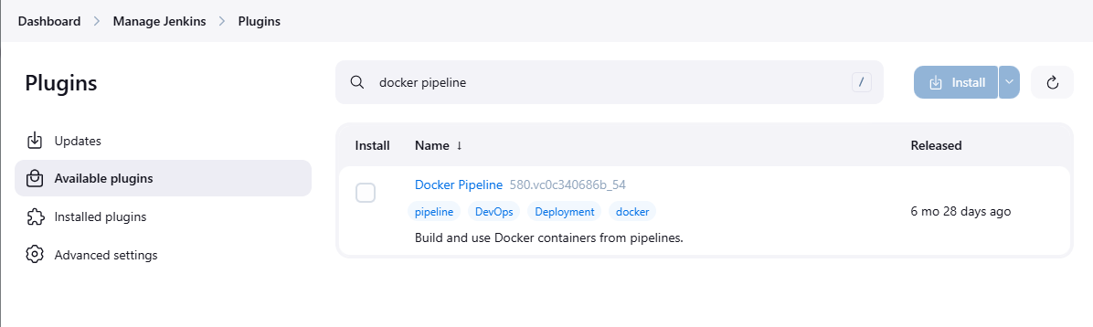 - Install Docker Plugin for Jenkins: In Jenkins, go to "Manage Jenkins" > "Manage Plugins" and install the "Docker Pipeline" plugin if it’s not already installed.