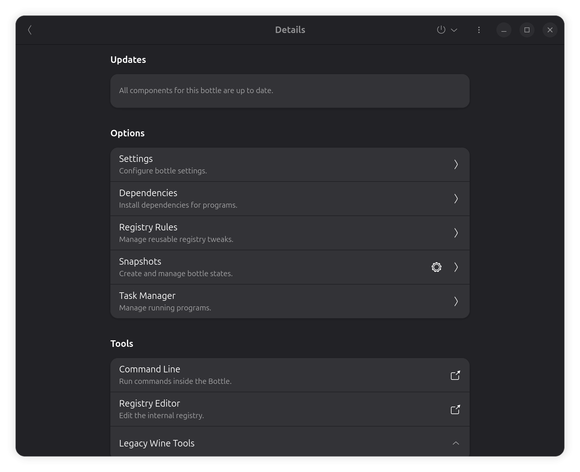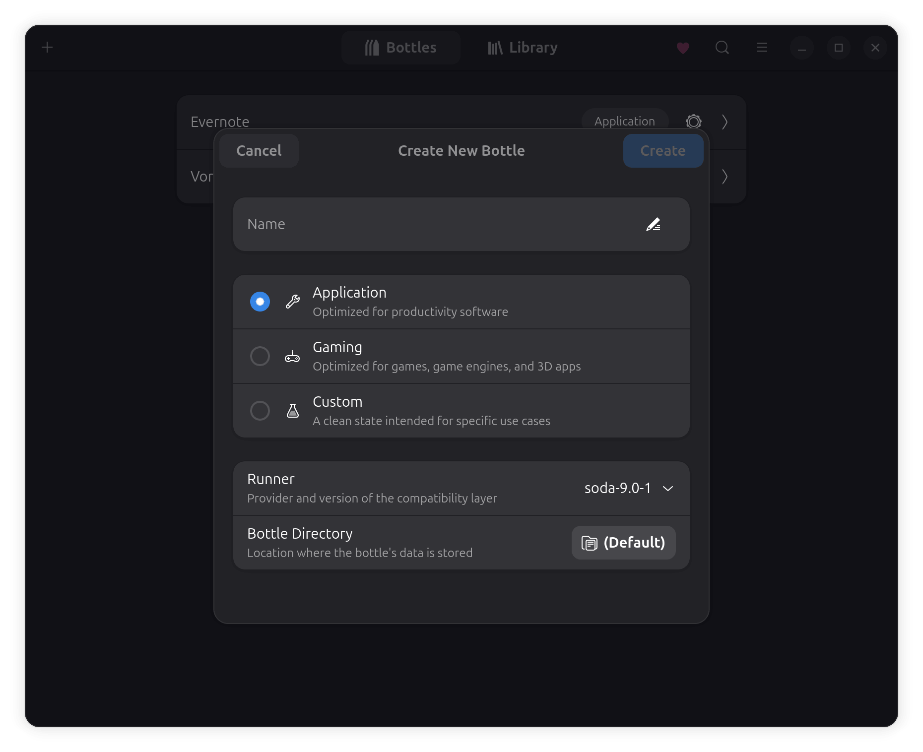 - Click Create. Bottles will spin up a fresh Wine prefix (≈ 200 MB) and open the bottle’s management page.