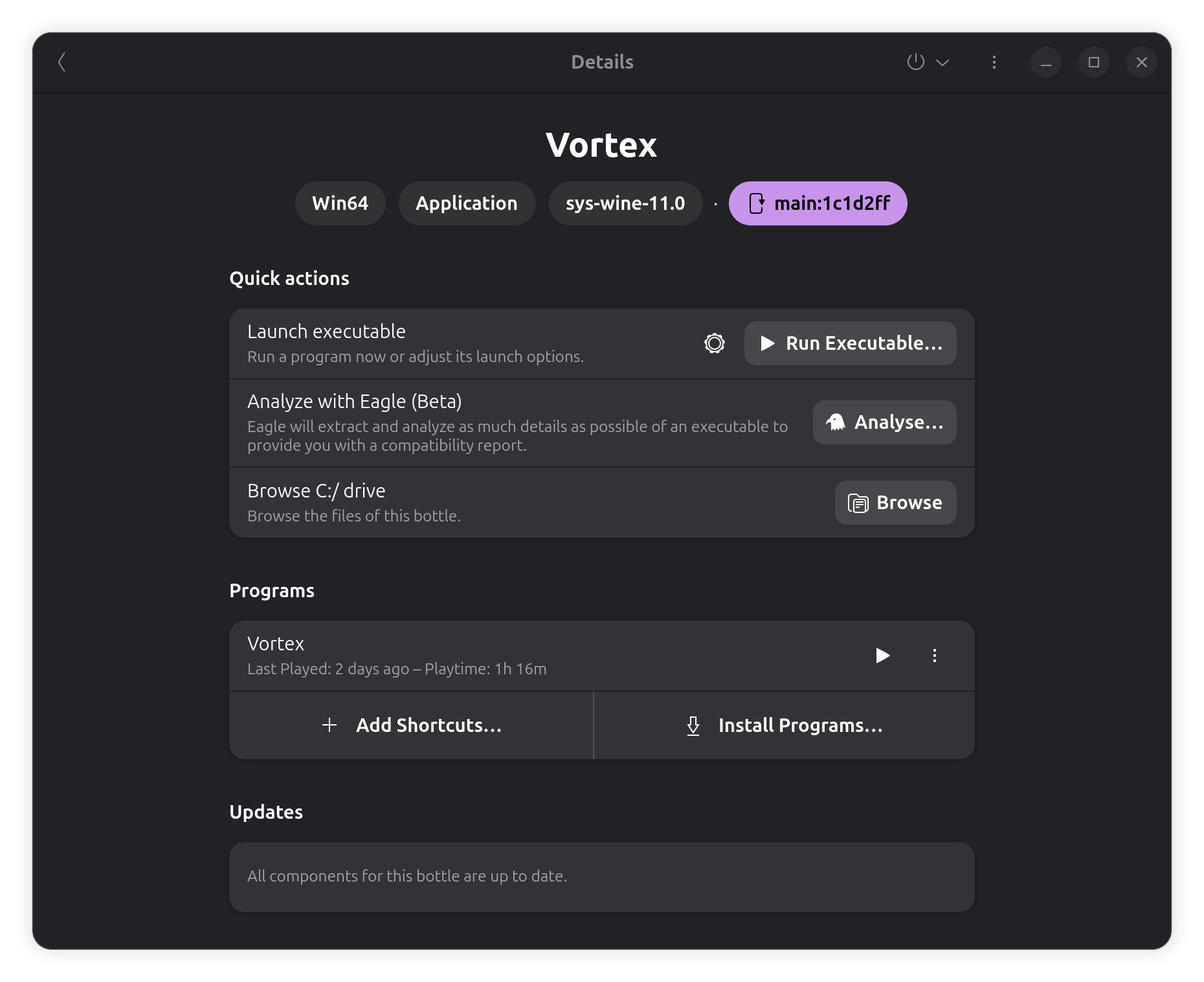 ~/Downloads/vortex):- In the Bottles UI, with the Vortex bottle selected, click the Run executable (▶) button.